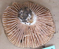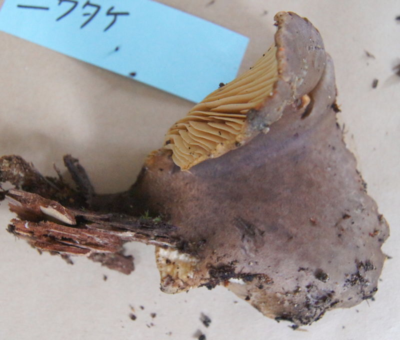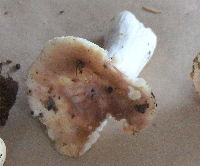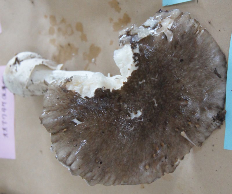 | 27 ニセクロハツ? Russula subnigricans Hongo ? 同定/幸徳 切断すると肉は赤変するが時間が経っても黒変はしない点とヒダが白色である点からニセクロハツに極めて近い。しかし、赤変性が弱い点においてやや疑問が残る。 |